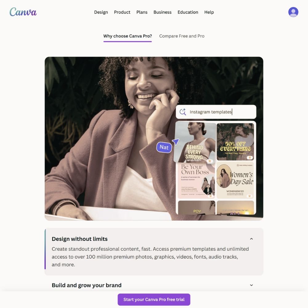 It’s cloud-based, so you can start designing on your laptop and finish on your phone. Collaboration tools make sharing with editors or assistants seamless. Canva Pro helps you stay consistent, creative, and visually confident in everything you produce.