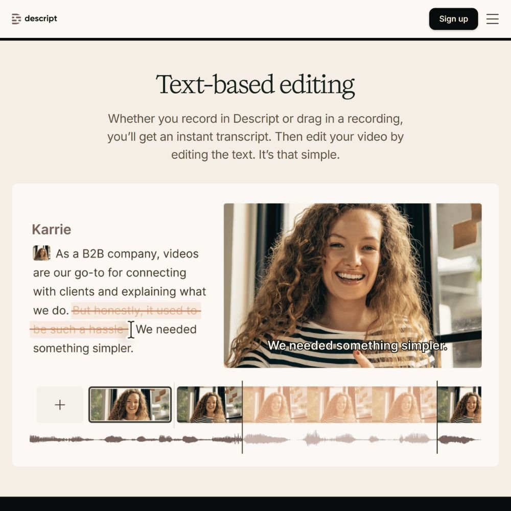 Descript turns video and audio editing into an intuitive process for creators who want great results without technical headaches. Once you upload a recording, Descript generates a full transcript you can edit like a document. Delete or rearrange text, and your video updates automatically.